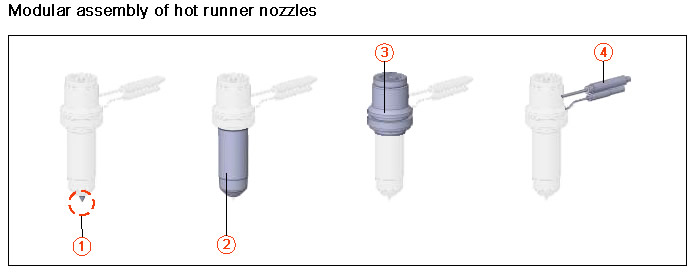 Fan gate, Flash gate, Ring gate, Sprue gate and sub gate. Nozzle length up to 600 mm and diameter up to 32 mm are available.